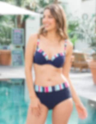 Bikinitrosa i maximodell med mönstrad nedvikbar överkant. Låg benskärning.