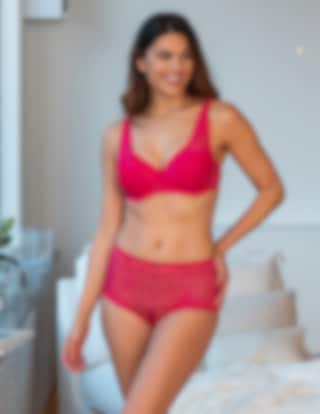 Feminint uttryck: Täckande spets i en starkt ceriserosa nyans som ger en elegant och sensuell look.