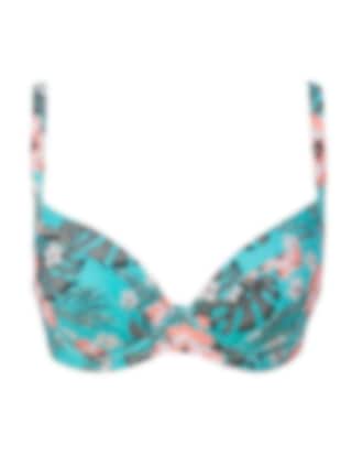 Färgglad bikini-bh med motiv av hawaiiblommor i turkost och ljusrosa. Byglad bh med insydd vaddering och veckat tyg på kuporna. Justerbara axelband.