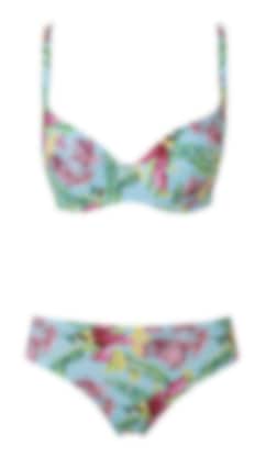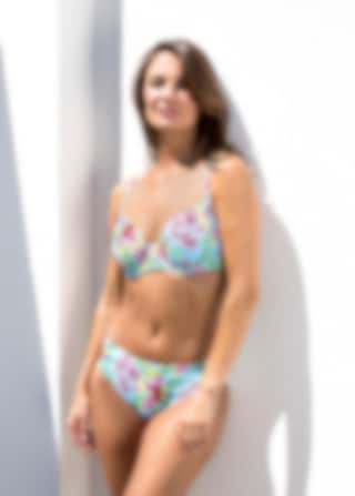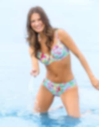 Färgglad bikini med mönster i rosa, gult och grönt.
