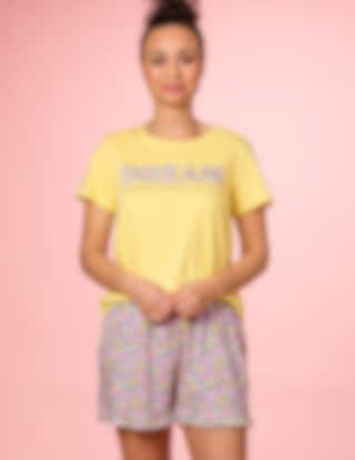 Enfärgad kortärmad topp med blommigt texttryck framtill.
