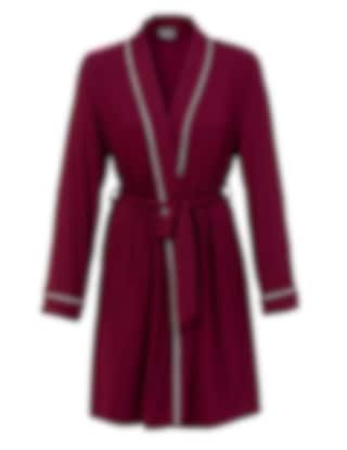 Elegant Bordeauxfärgad modell med vit piping som kontrasterande detalj.