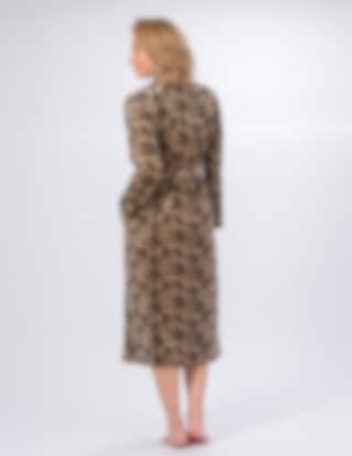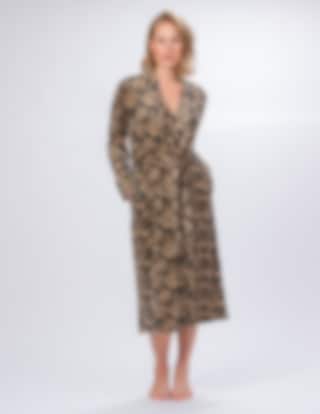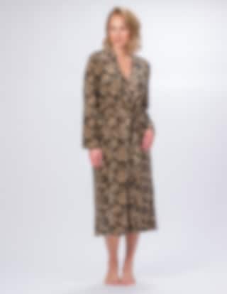 Rocken har kimonokrage, fickor i sidorna och avtagbart knytskärp i midjan.