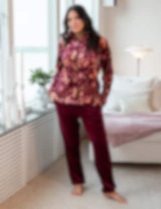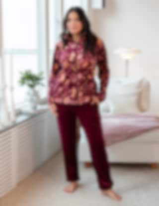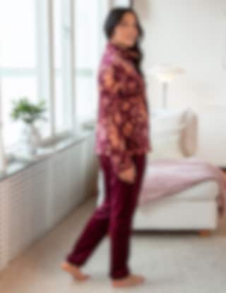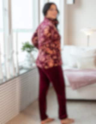 Jackan har dragkedja, ståkrage och ett blommönster i varma toner, medan byxorna är enfärgade i en matchande bordeauxnyans.