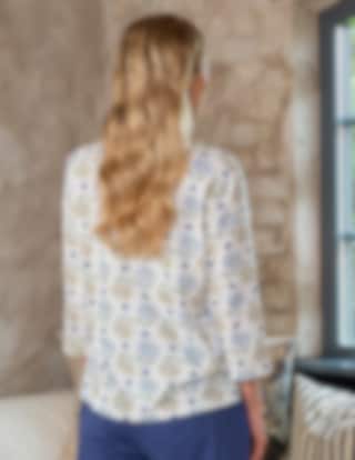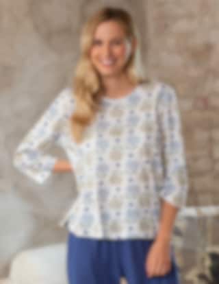 Tröjan har rund halsringning, trekvartslång ärm samt slits i sidorna nertill.